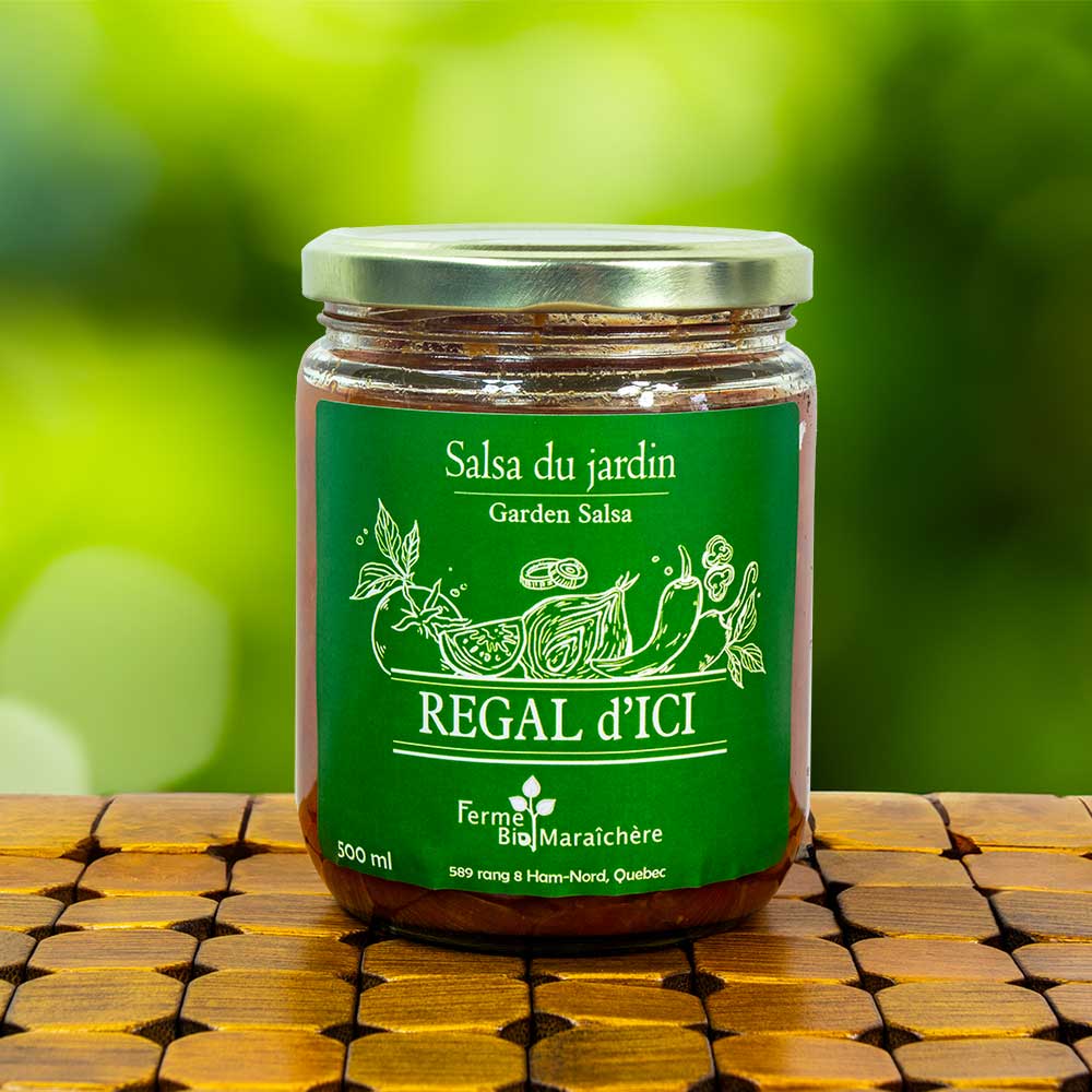Une explosion de saveurs et de couleurs! Impossible de résister au goût authentique de notre salsa du jardin, préparée avec les légumes frais cultivés chez nous — poivrons croquants, tomates italiennes juteuses et oignons rouges savoureux. Ces petites merveilles s'envolent sitôt sur le marché!